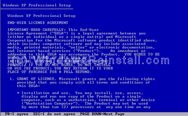 Windows XP License agreement, read, and if you agree press "F8" to continue, press "ESC" if you disagree. If you disagree setup will finish.